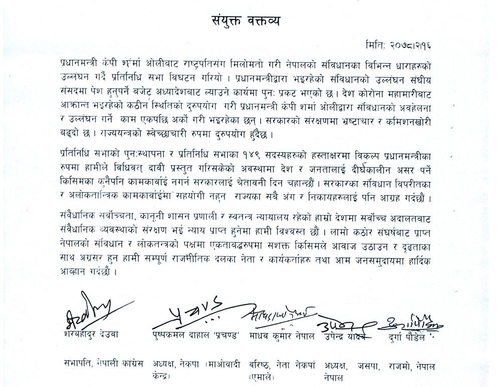 ‘प्रतिनिधिसभाको पुनस्थापना र प्रतिनिधिसभाका १४९ सदस्यहरुको हस्ताक्षरमा विकल्प प्रधानमन्त्रीका रुपमा हामीले विधिवत् दावी प्रस्तुत गरिसकेको अवस्थामा देश र जनतालाई दीर्घकालीन असर पर्ने किसिमका कुनैपनि कामकारवाही नगर्न सरकारलाई चेतावनी दिन चाहन्छौं।सरकारका संविधान विपरितका र अलोकतान्त्रिक कामकारवाहीमा सहयोग नुन राज्यका सबै अंग र निकायहरुलाई पनि आग्रह गर्दछौं,’वक्तत्वयमा उल्लेख।
