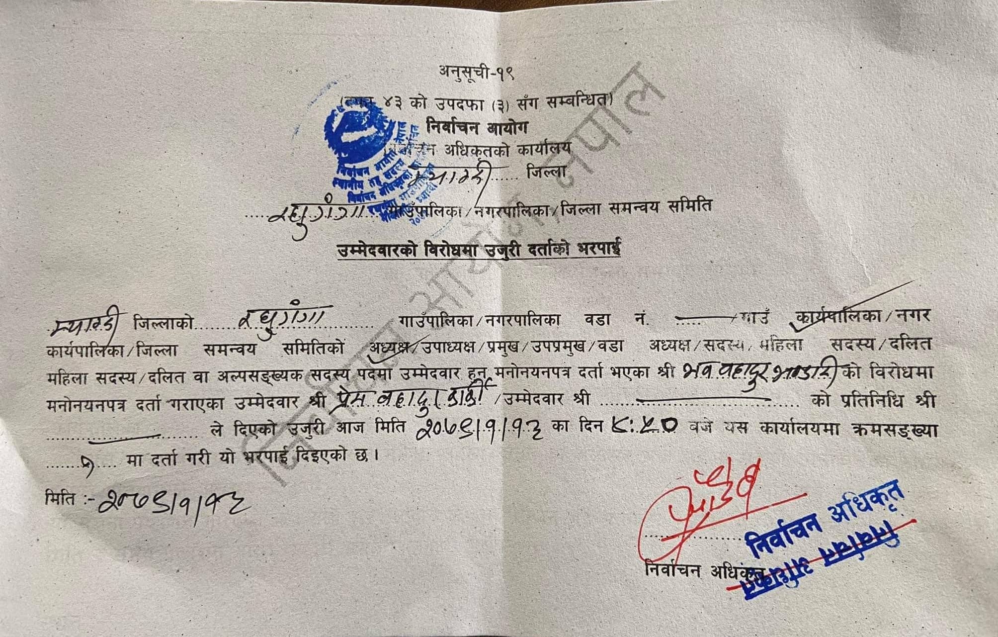 नेपाली कांग्रेसका तर्फबाट रघुगंगाका अध्यक्षका उम्मेदवार भण्डारीका विरुद्ध निर्वाचन कार्यालयमा उजुरी